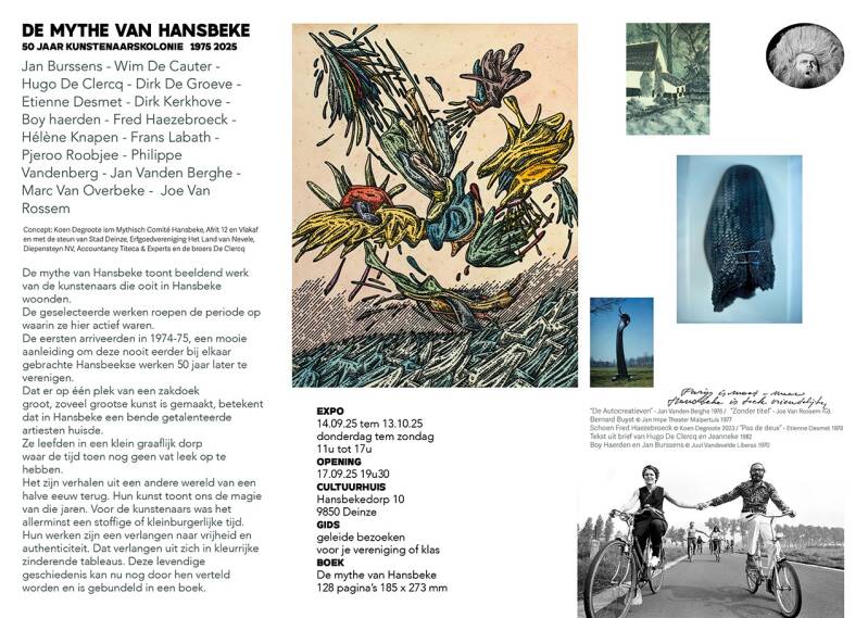 De vernissage van "De Mythe van Hansbeke" vindt plaats op woensdag 17 september 2025 om 19u30 in het Cultuurhuis, Hansbekedorp 10 te Deinze met inleiding door Willem Elias.