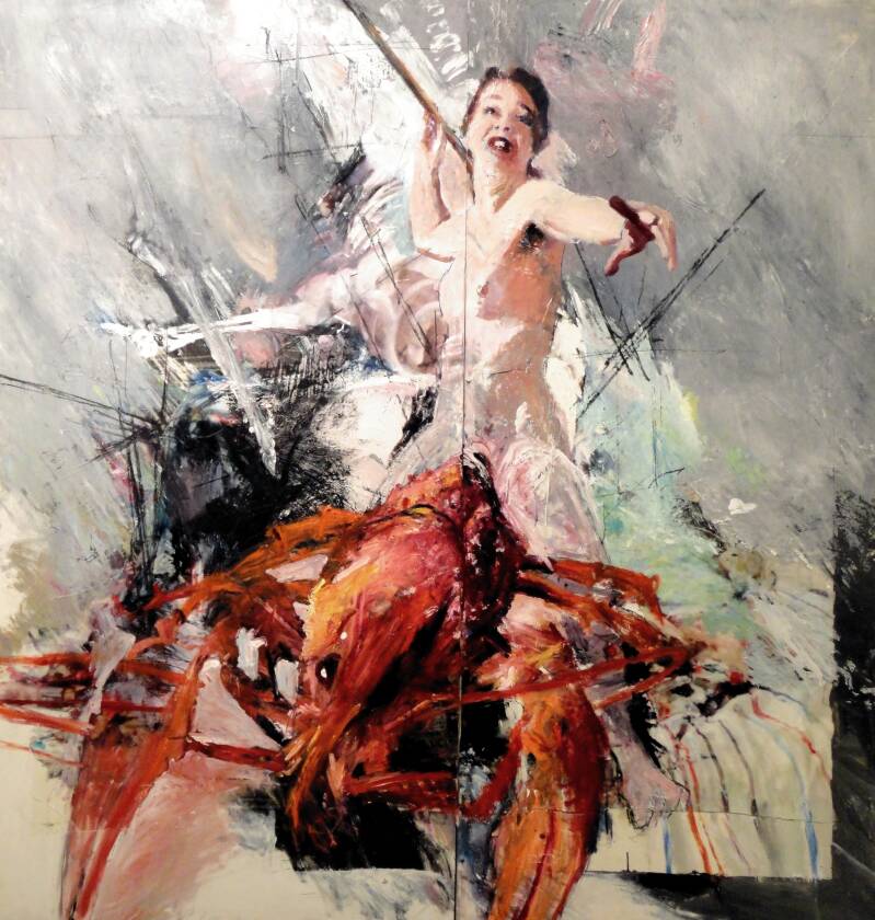 Ulrike Bolenz is in eerste instantie een rasecht schilder, een ware ‘verfeter’, die niet alleen met penselen schildert, maar tevens met handen en voeten. Ulrike is zelf één en al een krawietelende kwast. In ‘Godin Europa’, een zelfportret, is ze gezeten op een reuzekreeft. Ik kan me niet van de indruk ontdoen dat dit schaaldier een deel van het ‘zelf’ van het portret is en dat Ulrike schildert zoals een kreeft haar prooi verorbert, zonder tafelmanieren.